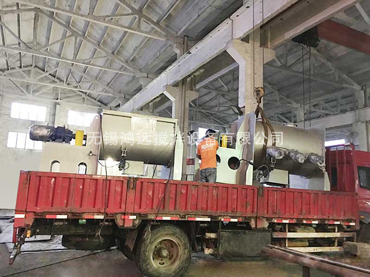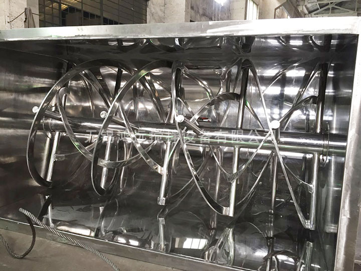 臥式螺帶混合機由U形容器、螺條攪拌葉片和傳動部件組成;螺條狀葉片一般做成雙層或三層,外層螺條將物料從兩側(cè)向中央?yún)R集,內(nèi)層螺條將物料從中央向兩側(cè)輸送,形成對流混合。螺條混合機對于粘性或有凝聚性的粉粒體的混合以及粉粒體中添加液體及糊狀物料的混合有良好的效果,筒蓋可做成全開式門,以便于對設(shè)備進行清洗替換產(chǎn)品。